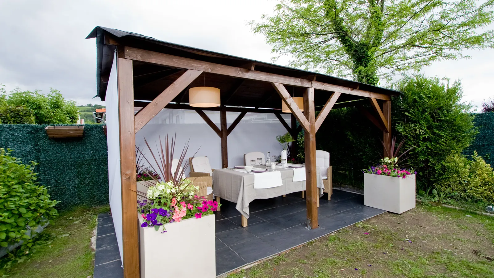 Además, conseguiremos convertir este lugar en una zona resguardada colocando unos toldos de color blanco. Para terminar esta tarea, instalaremos dos lámparas y decoraremos la mesa con una preciosa cristalería y cubertería.