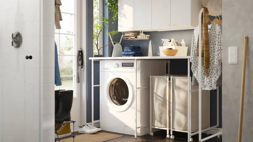 Utiliza ganchos o barras para colgar ropa que necesita secarse al aire o para accesorios como tablas de planchar. Las cestas te ayudan a organizar la ropa por tipo o color antes de lavarlas. Elige modelos que se apilen para ahorrar espacio.