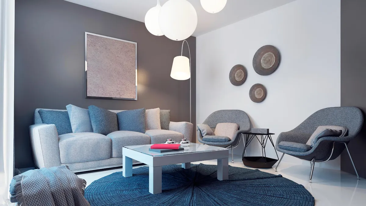 Decoración de salón en azul, gris y marrón