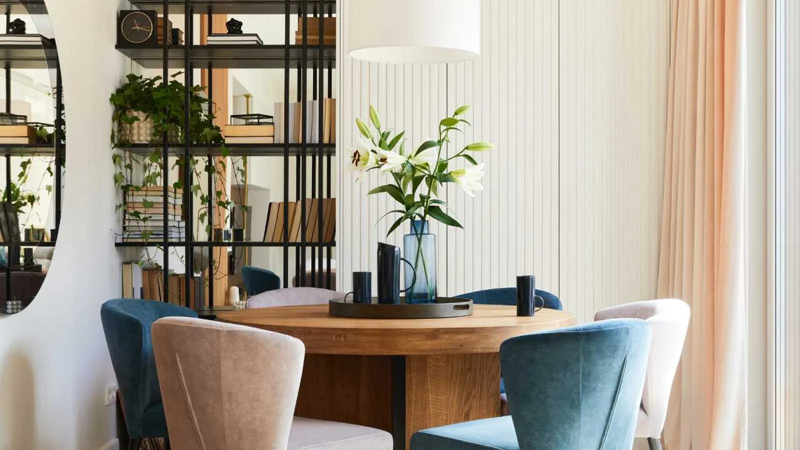 Una mesa redonda con superficie de cristal puede ayudar a que la habitación parezca más despejada y es una gran elección para comedores pequeños. Las sillas ligeras con respaldo abierto también pueden ayudar a crear la ilusión de más espacio.