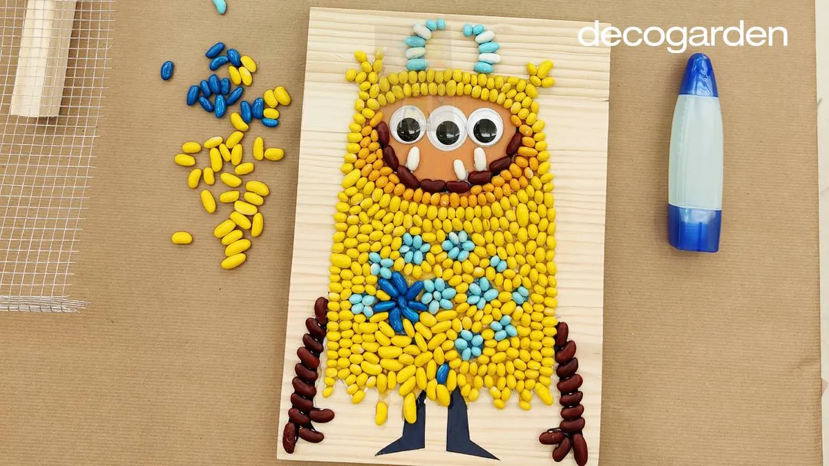 A continuación, te enseñamos a elaborar un precioso cuadro de un monstruito de colores hecho con alubias. Aunque se trata de un adorno infantil, algunos pasos de esta manualidad es mejor que los haga un adulto, aunque los niños pueden echar una mano en otros más sencillos.