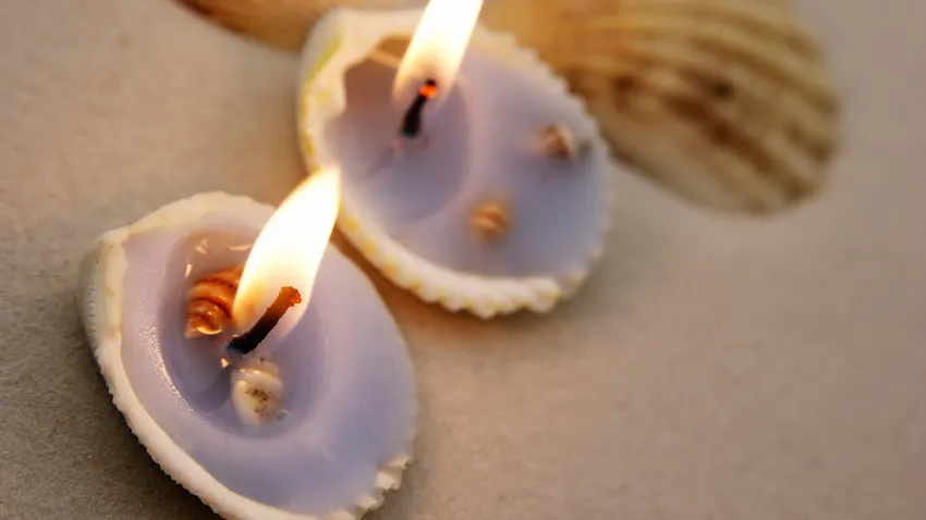 - Ata la mecha de vela a una arandela para hacer peso y colócala en la base interior de la concha. Añade la cera derretida de las velas a cucharadas sobre la concha con la mecha.