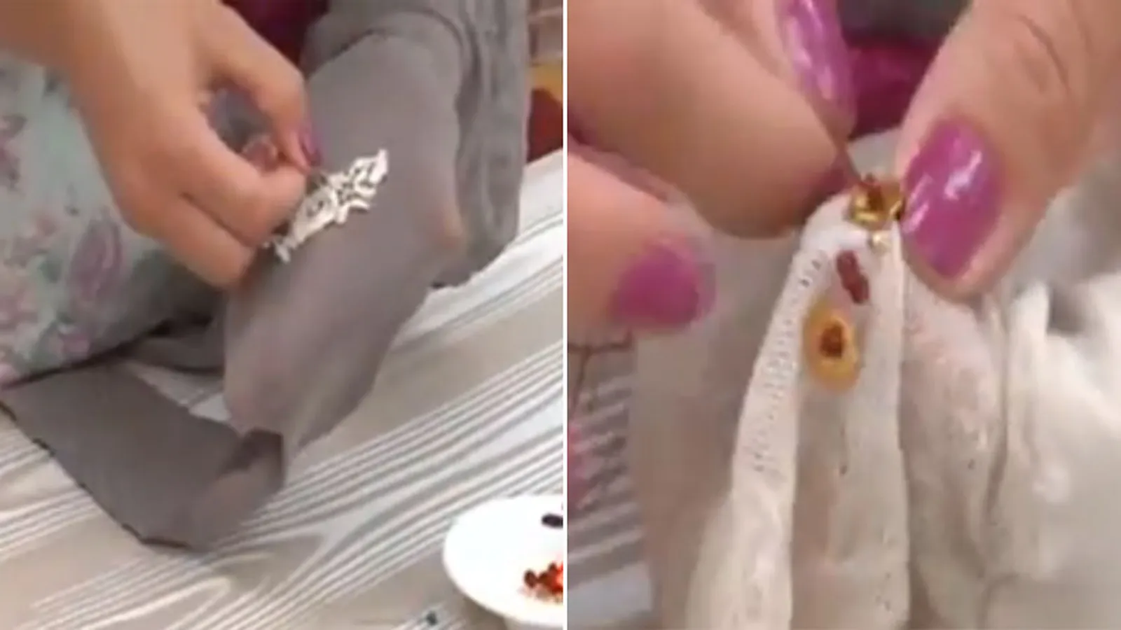 Después, estiramos bien la media y hacemos puntadas flojas. Además, junto a las flores cosemos unas perlas.