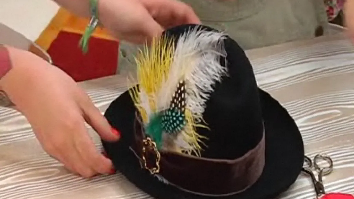 Después colocamos el ornamento de plumas clavado provisionalmente en la cinta del sombrero.