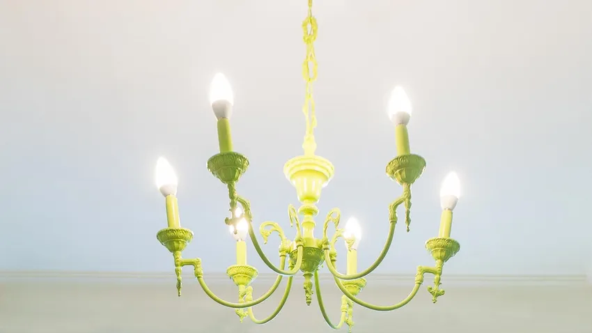 Damos vida a una antigua lámpara araña de techo pintándola en verde limón.