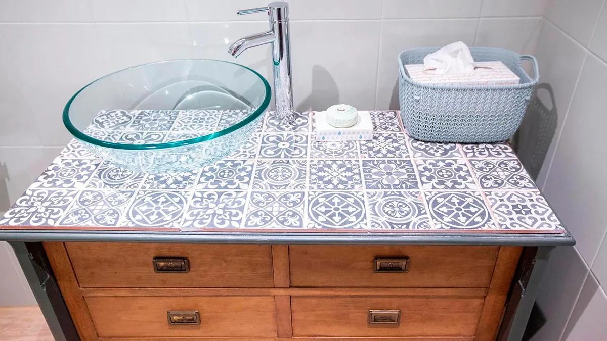 Transformamos una antigua cómoda en un original y práctico mueble para el lavabo con una bonita encimera de baldosas.