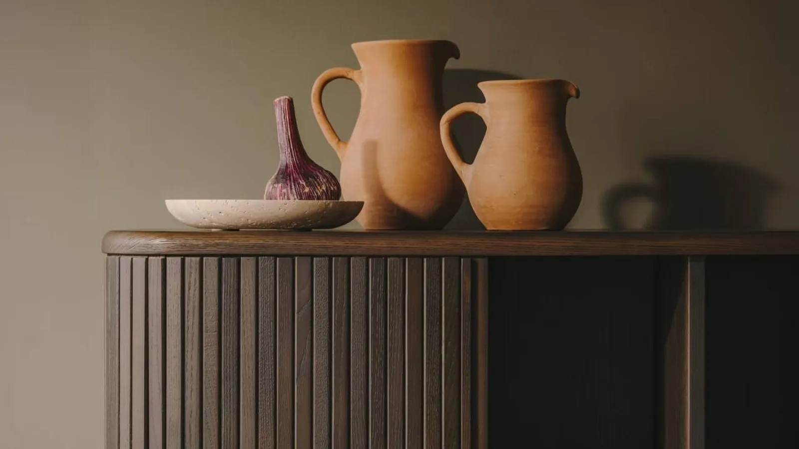 La colección Mailen de Kave Home acoge cuatro modelos de muebles de persiana tambour: Un aparador horizontal, un aparador alto, una mesilla de noche y un mueble para la TV.