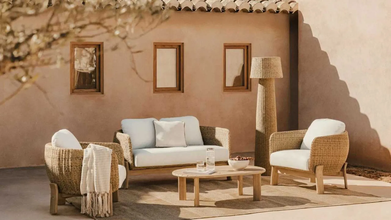 El conjunto de jardín Leilan de Sklum, con sus dos sillones y mesa de centro, en madera de acacia y ratán es una opción elegante y natural para decorar tu espacio exterior.
