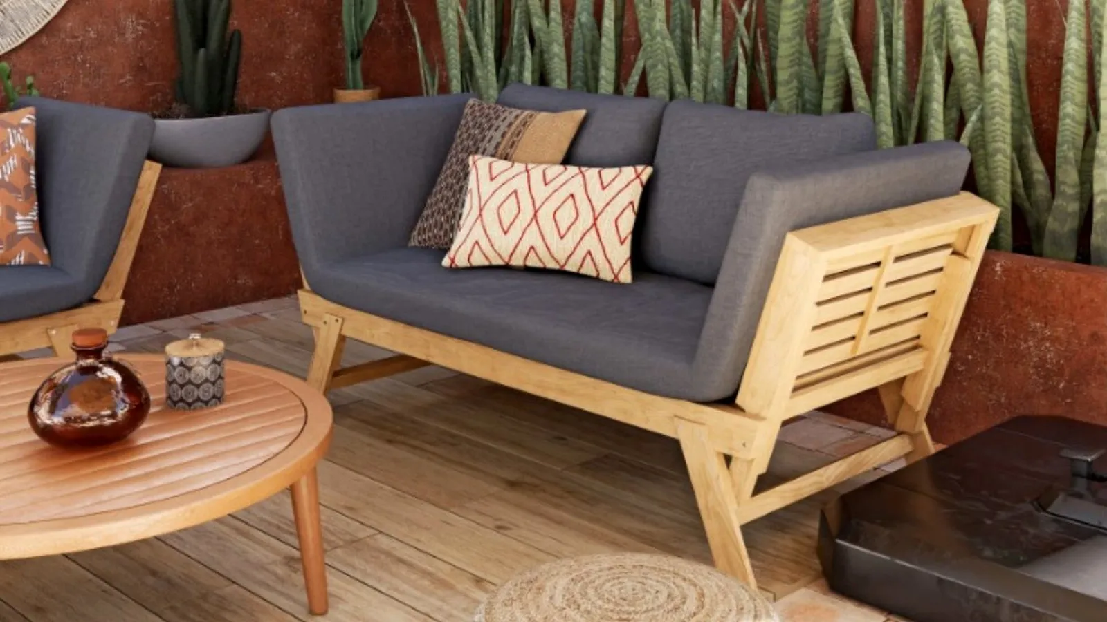La estructura de este sofá está fabricada en madera de acacia, un material ideal para exteriores por su gran resistencia a la humedad, durabilidad y belleza natural.