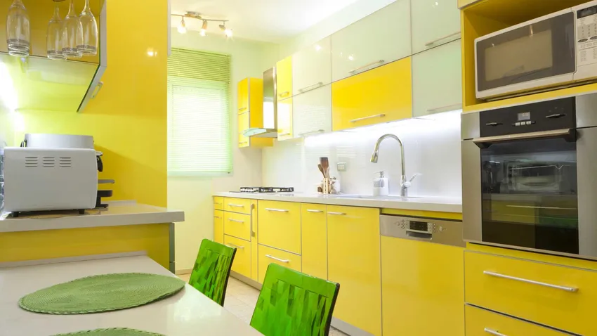 En esta ocasión os mostramos un ejemplo de cómo decorar una cocina de color amarilla. Este color principal está combinado con otros dos colores secundarios: el color verde y el color blanco. De esta manera, se logra una decoración totalmente luminosa y llena de energía.
