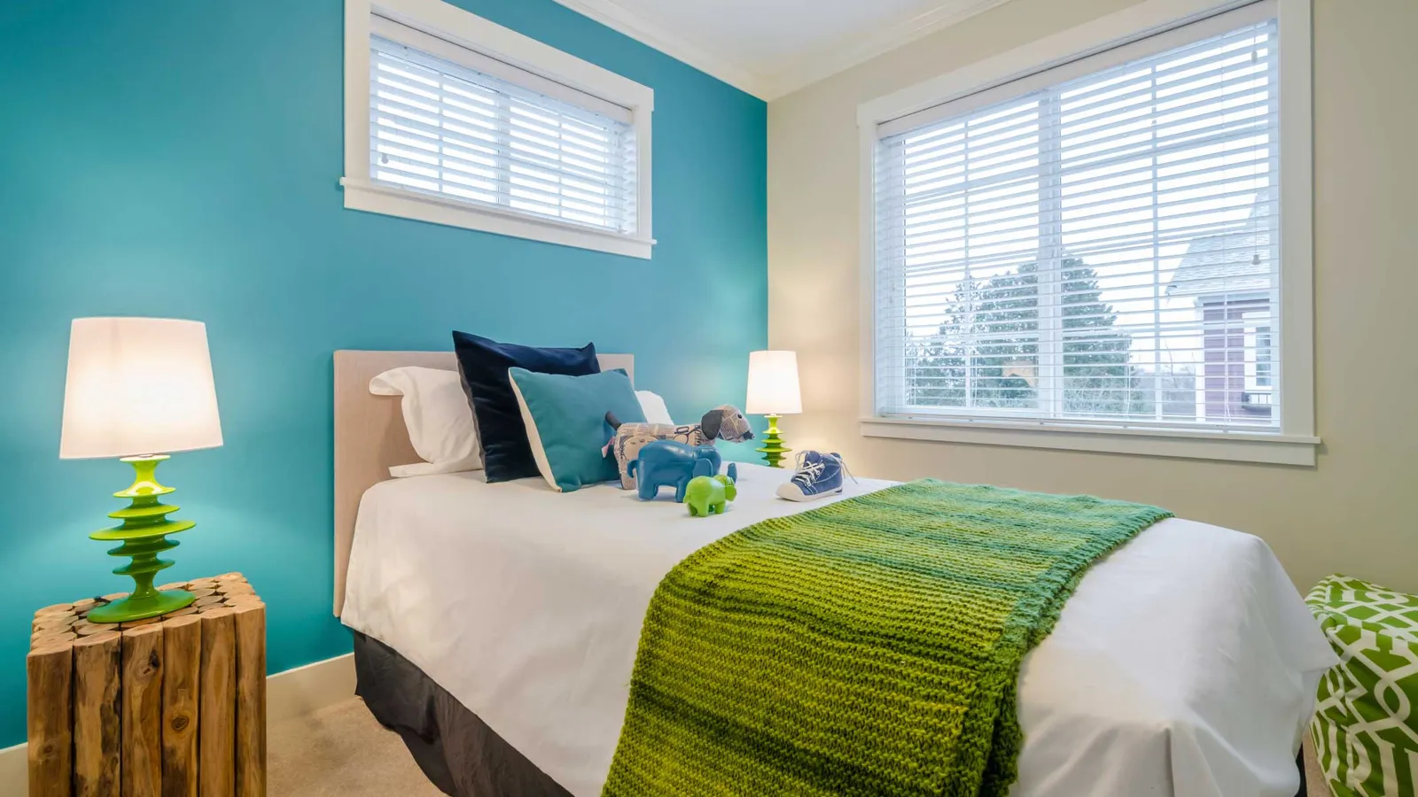 Por ello, en esta ocasión os proponemos una idea para utilizar los colores como el verde, el azul y el blanco a la hora de decorar un dormitorio juvenil. Se trata de un sencillo dormitorio con la pared principal del dormitorio en color azul y el resto en un tono beige. Para el mobiliario, un armario empotrado de color blanco y unas mesitas muy decorativas de madera. Sobre estas, unas lámparas modernas y juveniles de un color verde eléctrico que captan la atención.