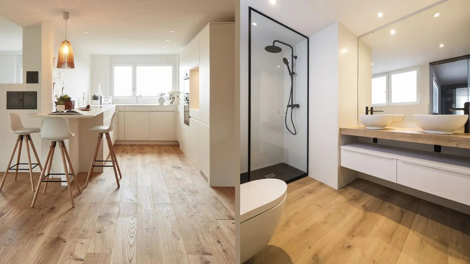 En las cocinas grandes o baños amplios es más fácil introducir madera real, porque al tener más espacio podemos salvar el suelo de madera de los grifos, bañeras, duchas, mamparas... Y en general, de las zonas más húmedas de este tipo de estancias. Pero, claro, esto es algo que no ocurre en baños y cocinas pequeñas, así que este tipo de materiales son estupendos.