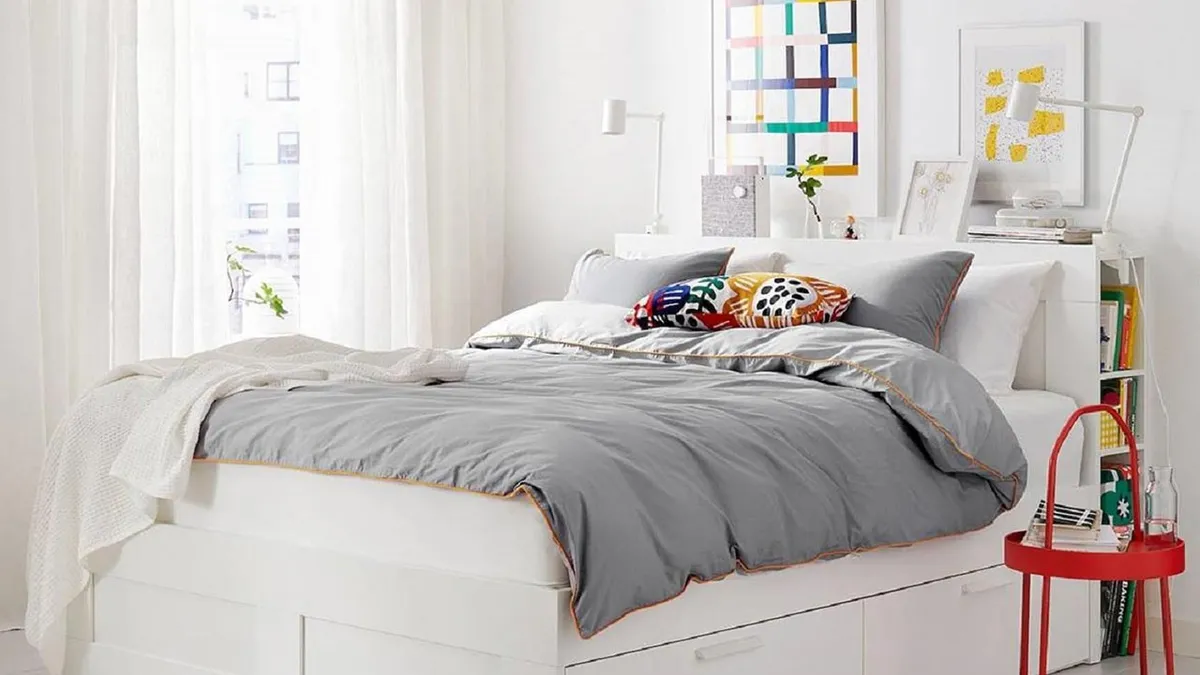 El cabecero Nordli es muy versátil y flexible, cuenta con mesitas integradas que puedes colocarlas a la altura que desees perfectas para dejar libros, el móvil, el, despertador, etc. Tienen un tapete de fieltro que tiene la capacidad de absorber los ruidos, mantener los objetos en su sitio y proteger la madera de posibles arañazos. Debajo de la cama cuenta con varios cajones amplios para guardar todo tipo de ropa y accesorios. Es uno de los cabeceros con almacenamiento de Ikea a un precio muy razonable.