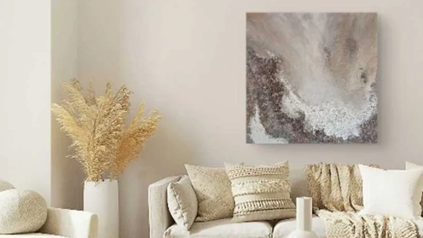 A la hora de colocar un cuadro, es crucial mantener el equilibrio visual. Por ejemplo, si lo vas a poner sobre un sofá u otro mueble, la obra debería medir entre dos tercios y tres cuartos del ancho de el mismo y colocarse a una altura de entre 15 y 25 cm. desde su borde, para que haya armonía en el espacio. Esto asegura que la pieza sea el punto focal sin desentonar.