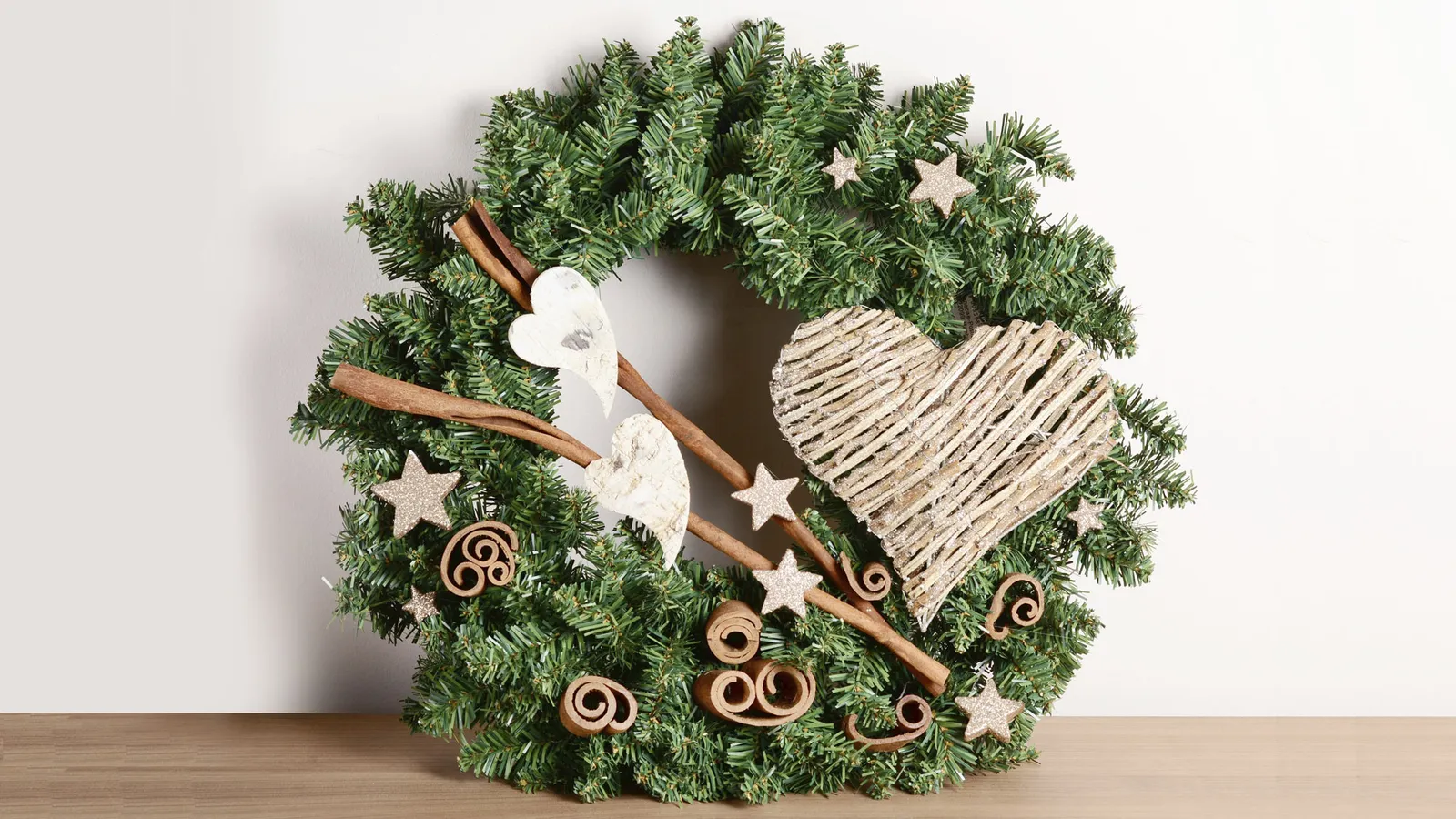 En el caso de los adornos, bastará con elegir unas sencillas estrellas con brillantina en color crema o marrón y unos trozos de madera curvada o trozos de cartón curvados. También se pueden fijar ramas de canela y pequeños adornos de estilo rústico como corazones de ramas secas o corazones y de cartón.