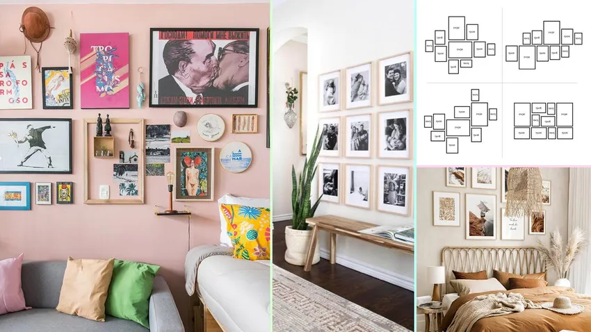 Por ejemplo, puedes decorar un estudio o un dormitorio juvenil con una galería de fotos e ilustraciones de moda, cine o música y la pared de un salón con fotos de paisajes.