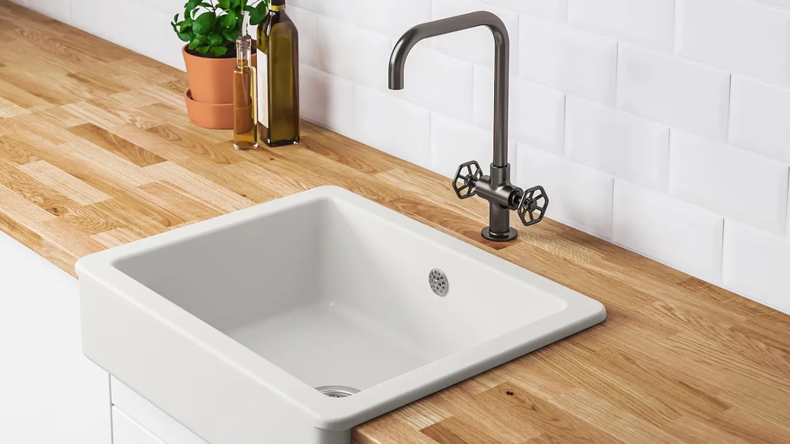 El fregadero HAVSEN con frente visto es ideal para cocinas tradicionales y se puede poner es una isla de cocina. La superficie de cerámica apenas requiere mantenimiento, así que podrás invertir tu tiempo en otras cosas.dd