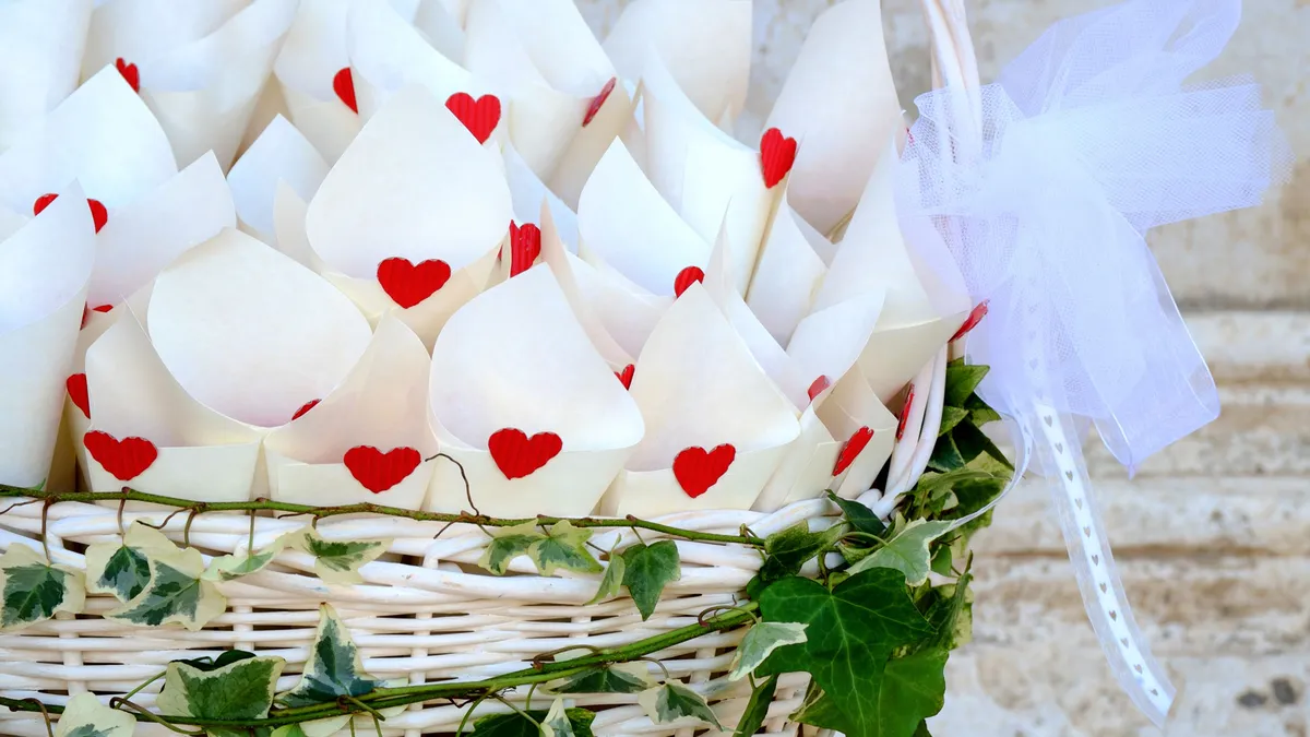 También las cestas en el exterior de la iglesia o el juzgado son perfectas para que los invitados puedan coger el arroz para tirarselo a los recién casados.