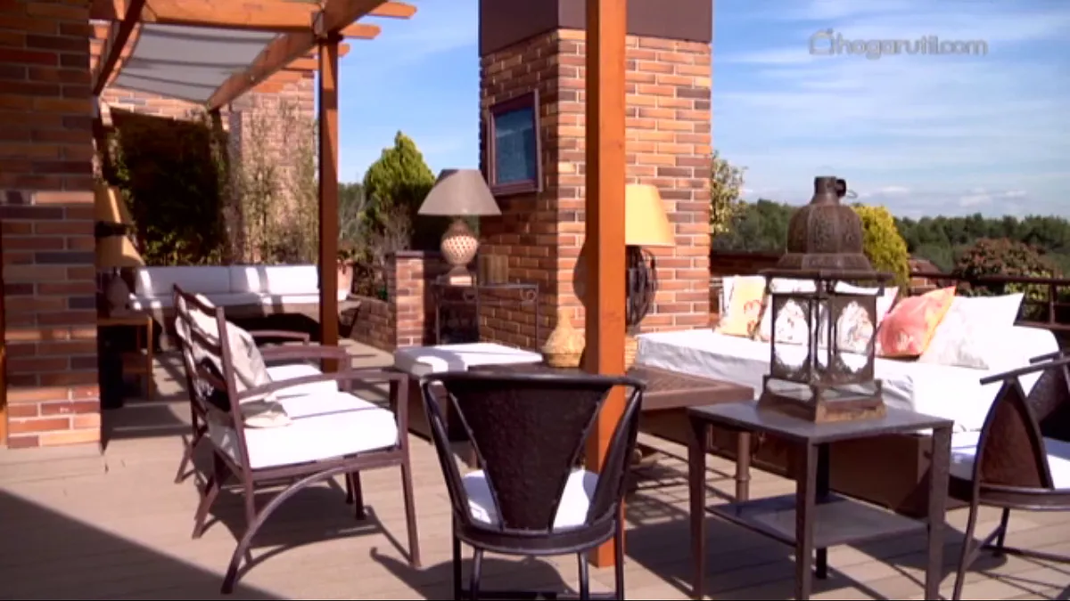 Para la zona de jardín se han elegido unos muebles de madera de teca y, para conseguir un aire fresco y urbanita, se han colocado unas velas de barco a modo de toldo.