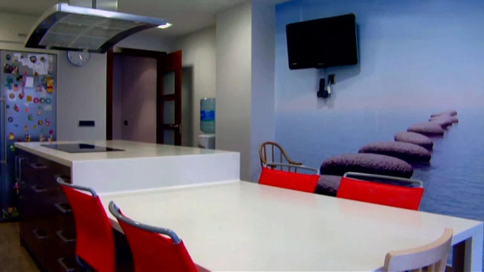 En el comedor, las sillas son rojas de un material muy especial: una pintura de polietileno que se reviste sobre una especie de esponja. La particularidad de la mesa es la pata, que es asimétrica. Es de madera de nogal, una madera a la que afecta mucho la luz directa del sol, por lo que hay que ser precavido.