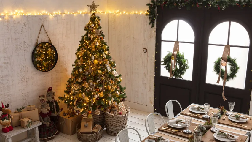 Los adornos más utilizados para decorar el árbol de Navidad suelen ser de madera y junto al árbol se pueden colocar cestas de mimbre o elementos de yete.