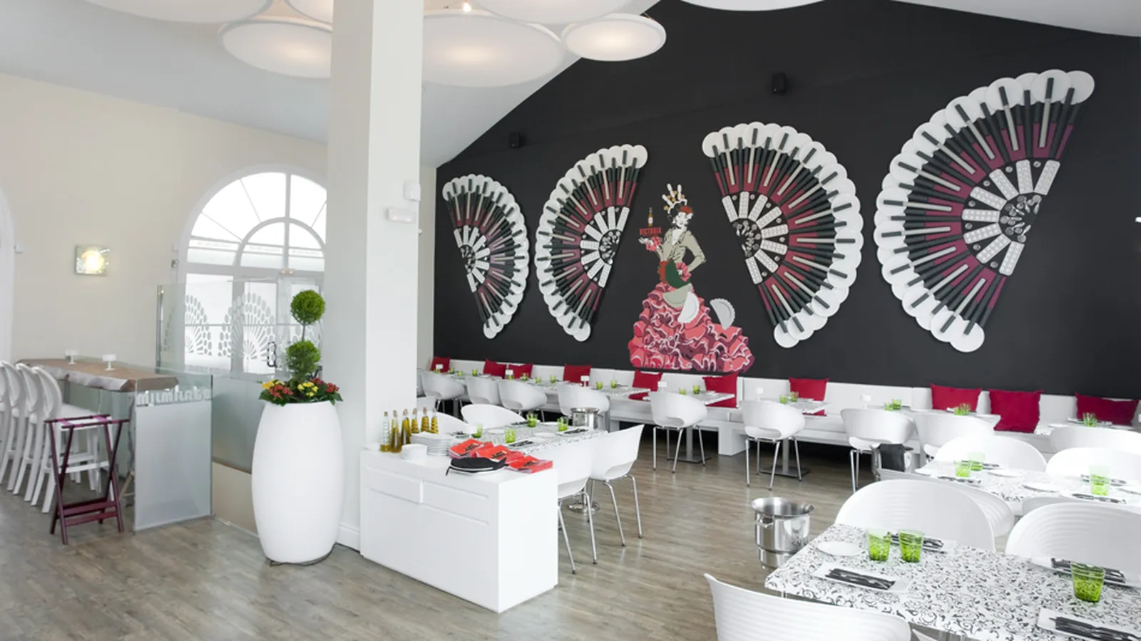Entonces, esta esencia o estilo también se ha aplicado a la decoración. El diseño y la decoración del local parten de una pieza tradicional andaluza como es el abanico, y se re-interpreta de una manera más vanguardista o moderna.