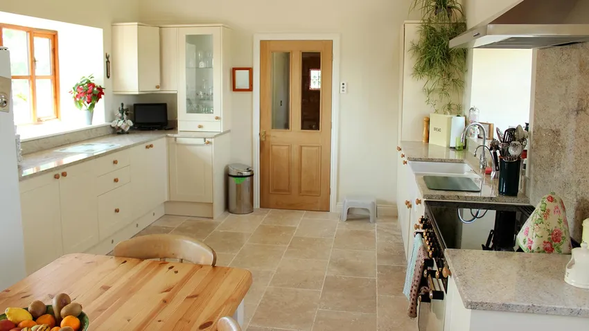 Suelo de cocina de mármol travertino.