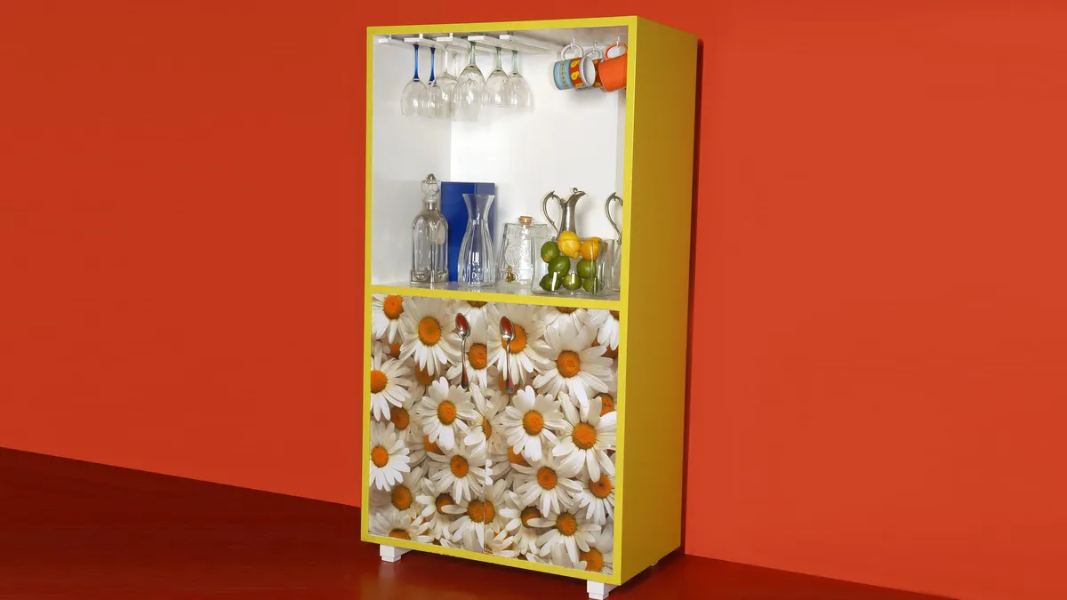 En esta ocasión vamos a reutilizar un mueble con puertas en la parte inferior para hacer una alacena colorida con papel pintado de flores.