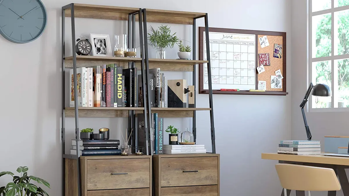 Si necesitas bastante capacidad de almacenaje de objetos que no son decorativos, puedes optar por la opción de una estantería escalonada con cajones.