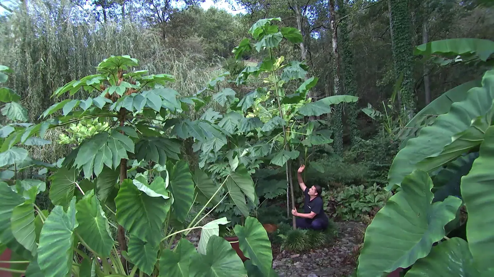 Iñigo Segurola se encuentra en Lurgarden, su jardín con 16 espacios temáticos. En concreto, está en la parte dedicada a las plantas con hojas de gran tamaño. ¡Parece una selva tropical!