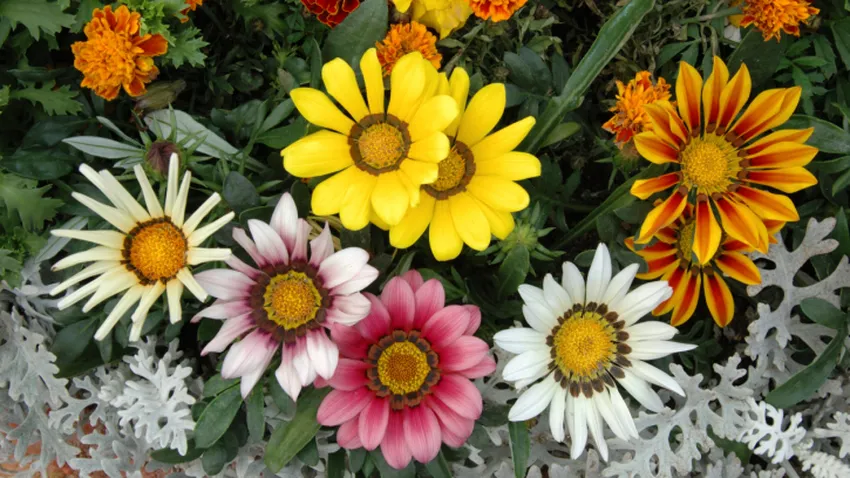 Existe una amplia variedad de gazanias según el color de sus flores y sus hojas tienen un color entre verde y plateado muy brillante.