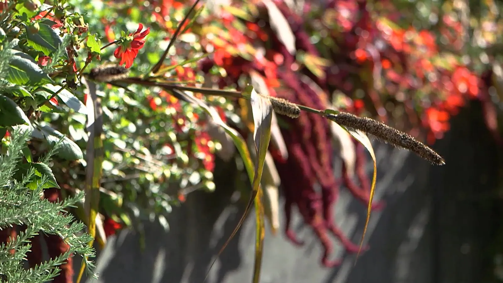 Una de las plantas de este parterre que ya esta llegando, en otoño, a su final y que se caracteriza por su aporte de follaje oscuro, casi negro, es el mijo, un cereal que se consume principalmente en África. En su día se consumía en todo el mundo pero con la aparición del maíz se sustituyó su consumo por este último.