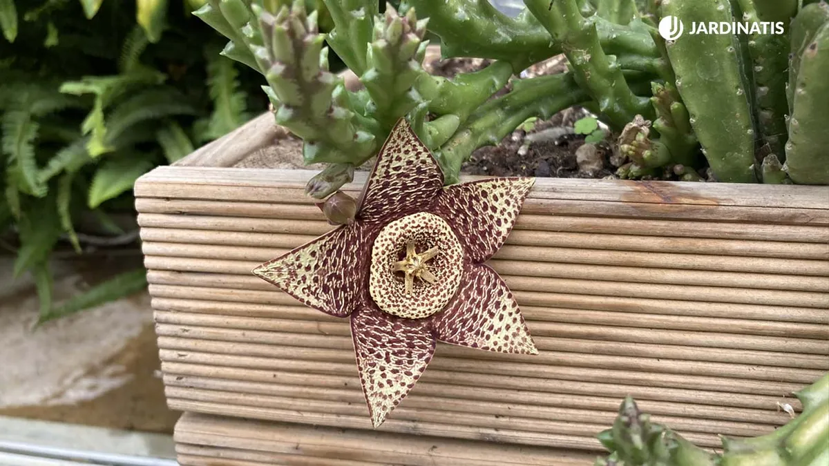 La flor de nuestra protagonista tiene forma estrellada y surge entre el verano y el otoño. Suele medir unos 20 centímetros de diámetro pero, hay especies como la Stapelia gigantea, que puede alcanzar los 40 centímetros.