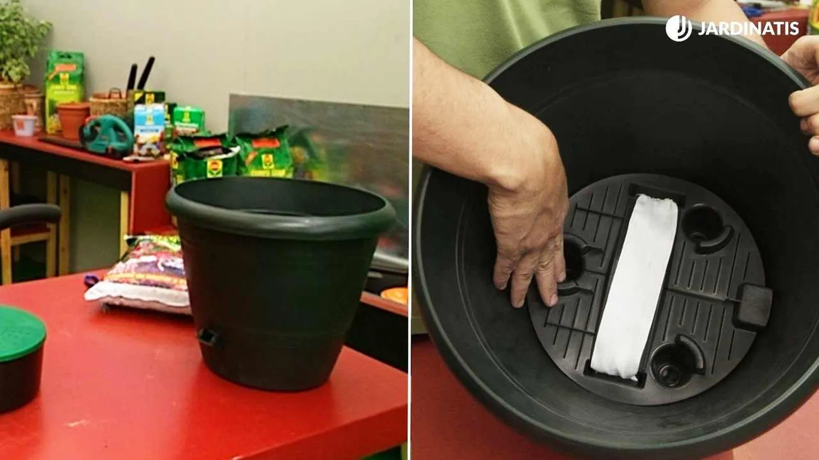 Cuando dicho depósito esté lleno, el agua sale por ese agujero, evitando así la acumulación que podría causar problemas de pudrición en las raíces de las plantas. En el interior del contenedor se coloca una tapa con una esterilla, encargada de transmitir el agua por capilaridad al sustrato. Hoy en día también poseen cuerdas de algodón que hacen la misma función.