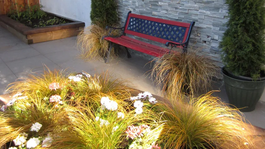 En esta ocasión, vamos a lograr protagonismo y estructura con unas gramíneas (carex testacea orange). Las plantaremos por diferentes zonas del contenedor con un mínimo de separación entre ellas. Después, para darle un toque de color vamos a plantar entre estas gramíneas unos geranios zonales. En este caso, utilizaremos geranios de color rosa y blanco. Para finalizar la plantación del parterre floral, colocaremos un par de margaritas del cabo que nos aportarán luminosidad y flor.