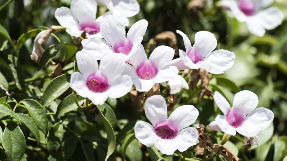La bignonia blanca (Pandorea Jasminoides) es una planta trepadora con tendencia a arbusto ideal para macetas.