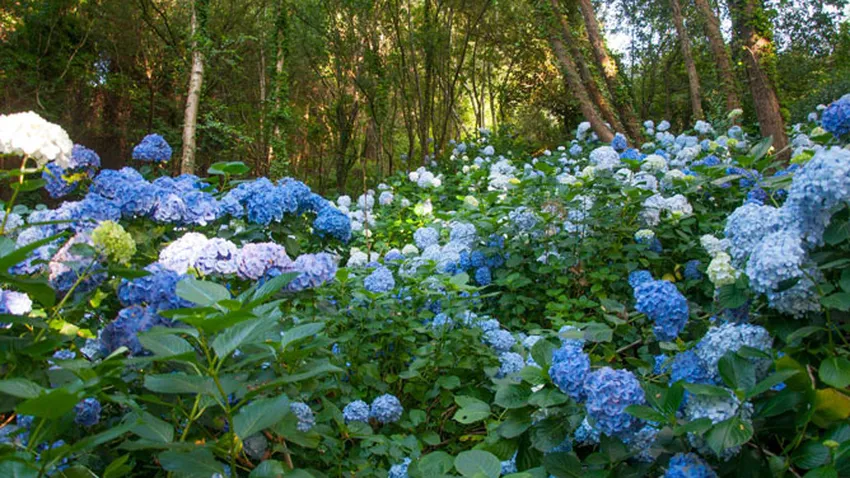 Bajo un bosque de acacias se ha creado un jardín utilizando exclusivamente hortensias, una planta que necesita mucha humedad ambiental, tierras arcillosas y un clima no muy cálido. La variedad que más prolifera en este jardín, es la más vigorosa de las hortensias ya que puede alcanzar los 3 metros de altura.