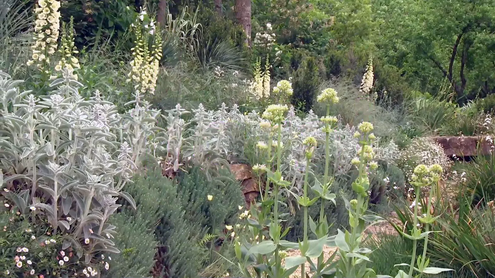 Lo primero que destaca de este jardín, por una parte, las flores verticales formadas por dedaleras o digitalis blancas que contrastan con los grises del stachys lanata.