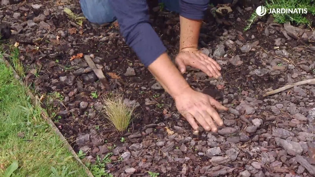 Por ejemplo, en esta parte del jardín realizamos un acolchado con corteza de pino para evitar la floración de plantas. Pasado un tiempo, en este caso cuatro años, la corteza de pino se ha transformado en sustrato, permitiendo la floración de nuevas plantas como una gramínea: la nassella tenuissima. Esta gramínea ha germinado espontáneamente y, ahora, vamos a aprovechar para recogerla y trasplantarla.
