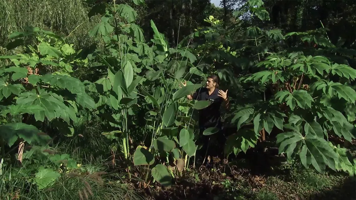 Iñigo Segurola se encuentra en el jardín de hojas grandes de su parque Lurgarden. Hace una semana ya os presentamos un árbol muy interesante, la Paulownia tomentosa, que puede llegar a desarrollar, en un primer año, los 5 metros de altura.