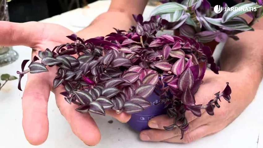 La Tradescantia zebrina Purple Passion es una tradescantia es una de las más especiales. Como ves, llama la atención a simple vista gracias a sus hojas lanceoladas de verde y plateado (haz) y púrpura y morado (envés).