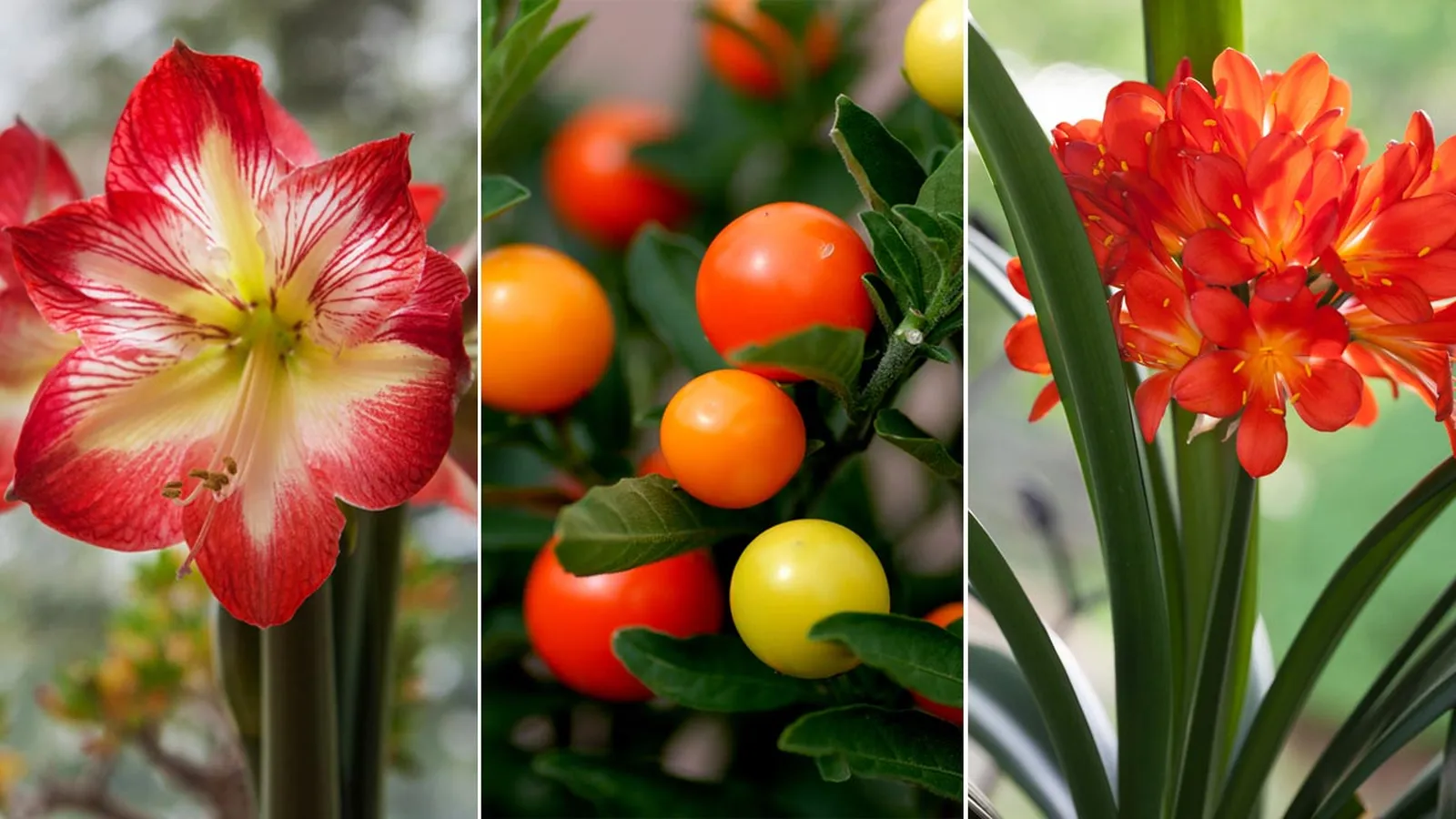Os presentamos 3 plantas con las que alegraréis los cortos y fríos días de invierno: el amarilis con sus grandes y atrevidas flores, la clivia con sus hojas recias y alargadas y sus vibrantes flores naranjas y el tomatillo de Jerusalén con sus llamativos frutos que parecen comestibles.