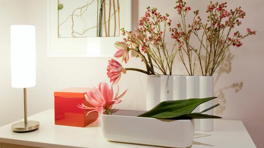 Para esta composición vamos a utilizar colores en tonos rosas con recipientes cerámicos en color blanco que combinarán perfectamente con una estancia en colores marrones claros.