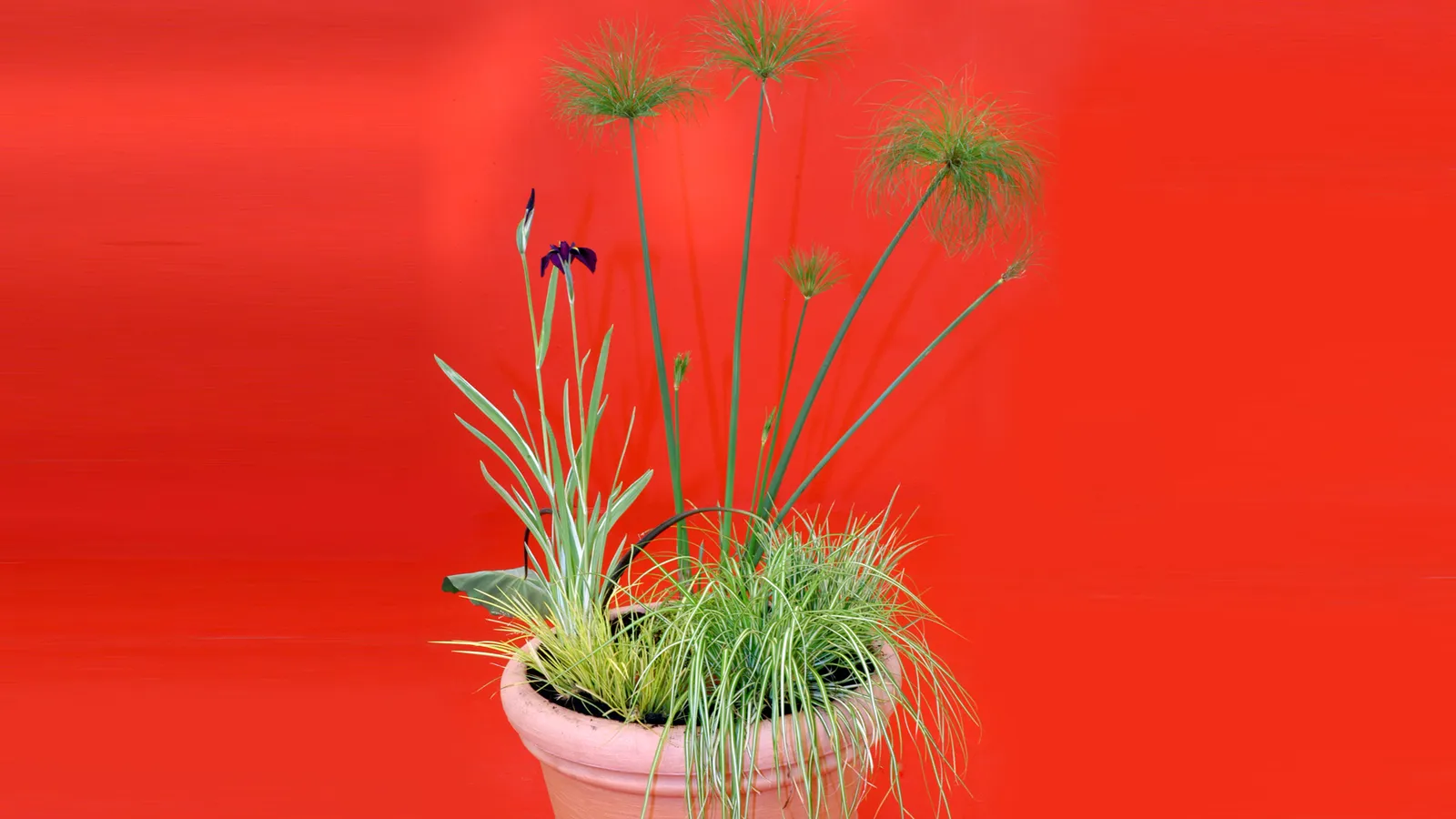 En este trabajo de jardinería Iñigo Segurola realiza una composición con papiro y plantas acuáticas.