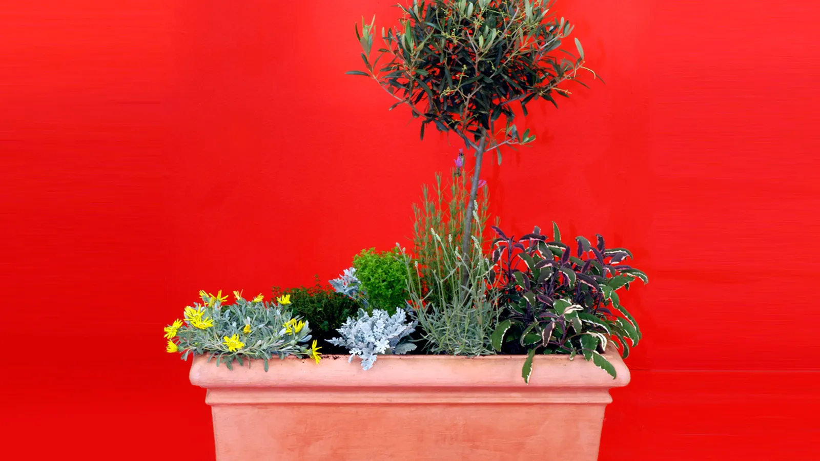 Junto a la salvia colocamos un pequeño olivo. Este árbol aportará verticalidad a la composición.
