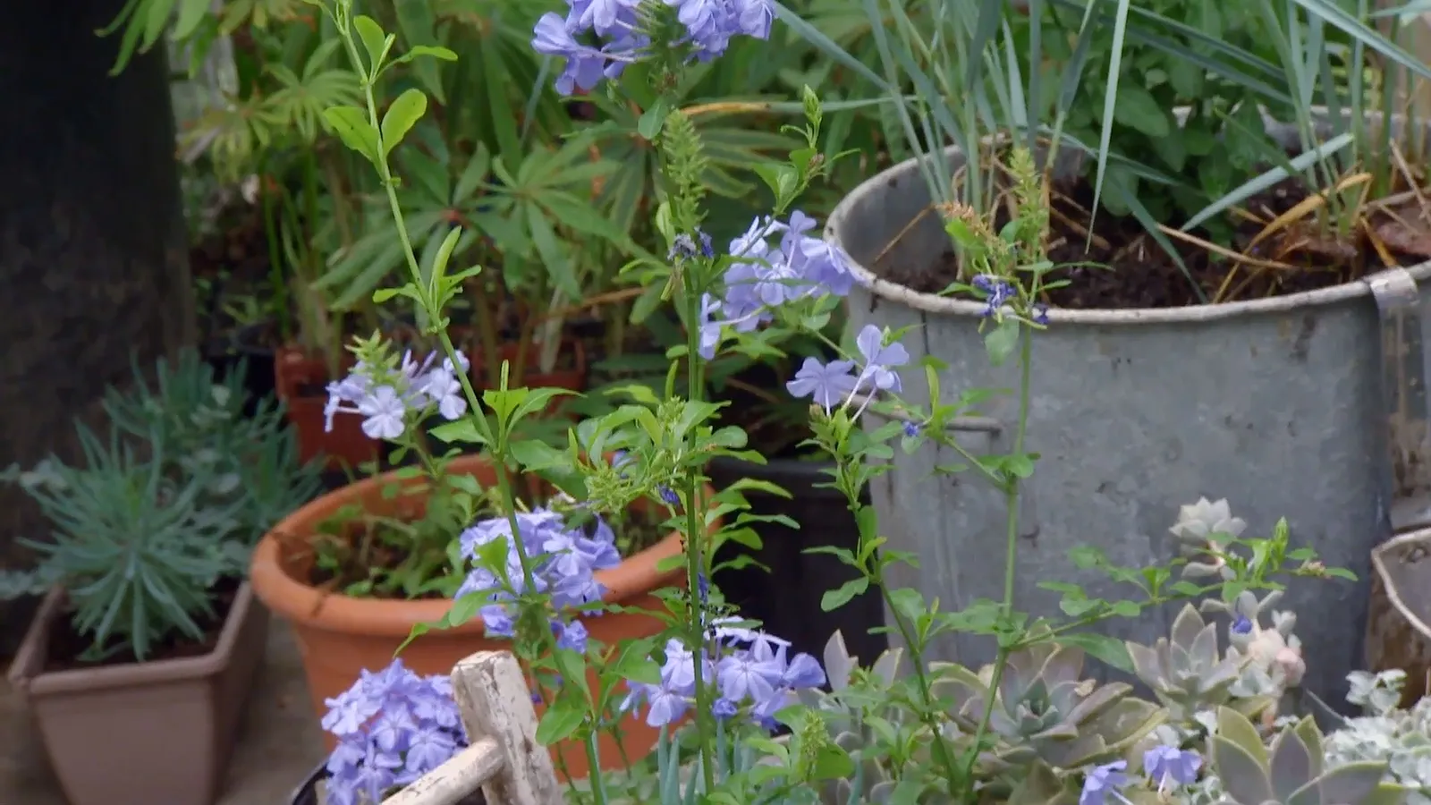 Para la composición utilizaremos unos recipientes de cinc envejecidos que realzarán el color azul de las plantas.