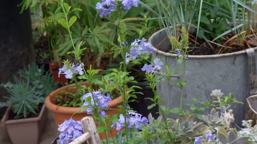 En un recipiente alto, colocaremos la planta trepadora plumbago capensis que la pondremos junto con unas plantas de leymus arenarius. Esta planta tiene un sistema radicular que se extiende muy rápidamente, por lo que es importante plantar en contenedor para evitar que se extienda por todo el jardín.
