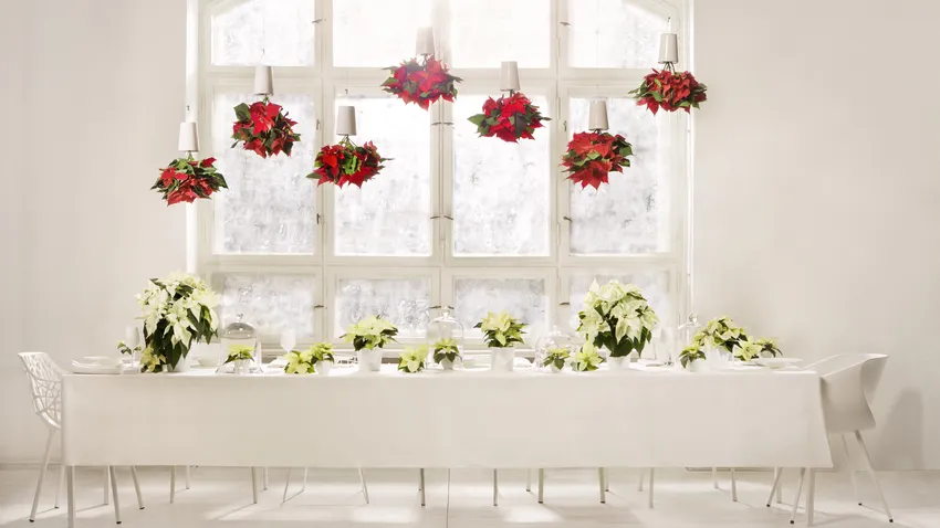 Utilizar macetas colgantes con Flor de Pascua en tu decoración navideña será un detalle que impresionará a todos tus invitados. ¡Una mesa de cuento!