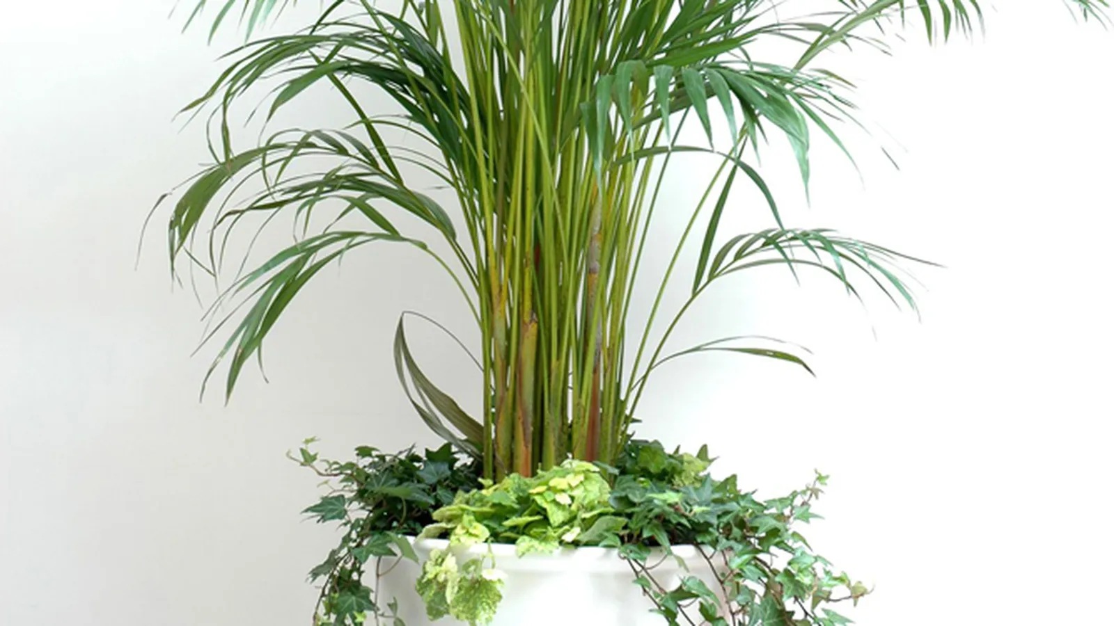 A continuación veremos cómo realizar la plantación de una areca catechu. Además, en la base del contenedor, vamos a colocar unas hiedras y unas tolmieas para completar la composición.
