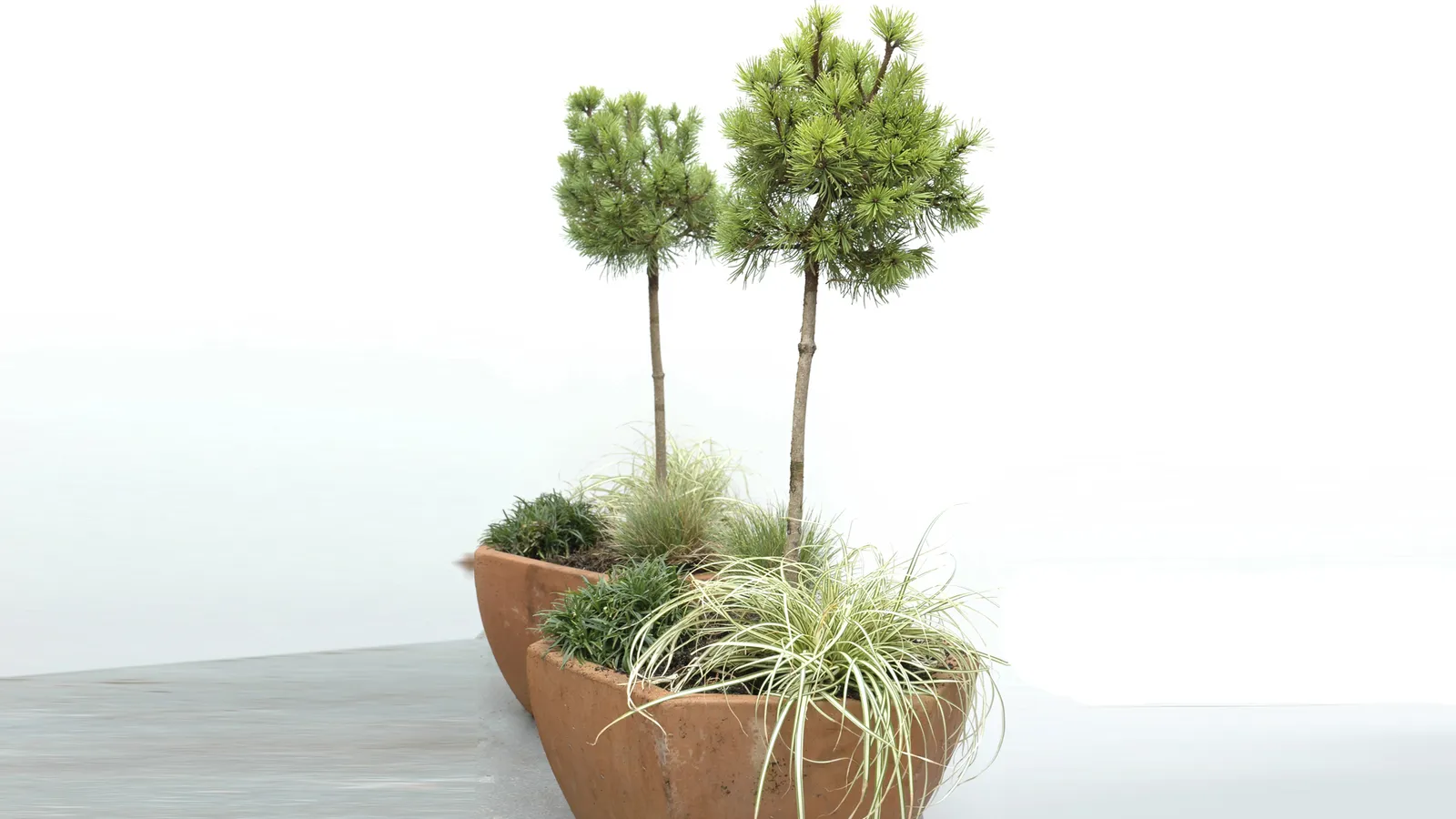Lo plantaremos con la llegada del otoño, aprovechando una maceta y el sustrato en el que teníamos plantas de verano. Acompañaremos nuestro pino enano con gramíneas, el ophiopogun y la festuca, que vestirán la base de nuestra pequeña conífera, y el carex, que con su porte colgante adornará la maceta y equilibrará la composición.
